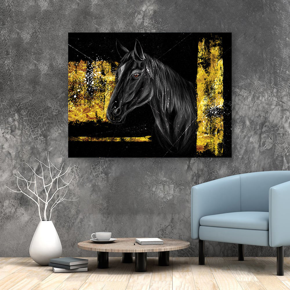 Un tablou elegant Black horse and golden patches, cu un cal negru si contraste de negru si auriu, pentru o locuinta moderna. Achizitioneaza-l acum!