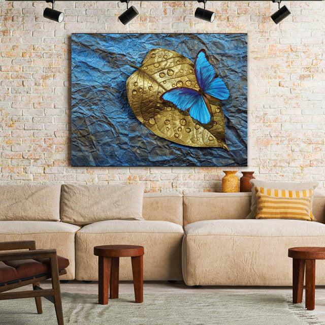 Tablou Canvas Blue Butterfly On A Golden Leaf