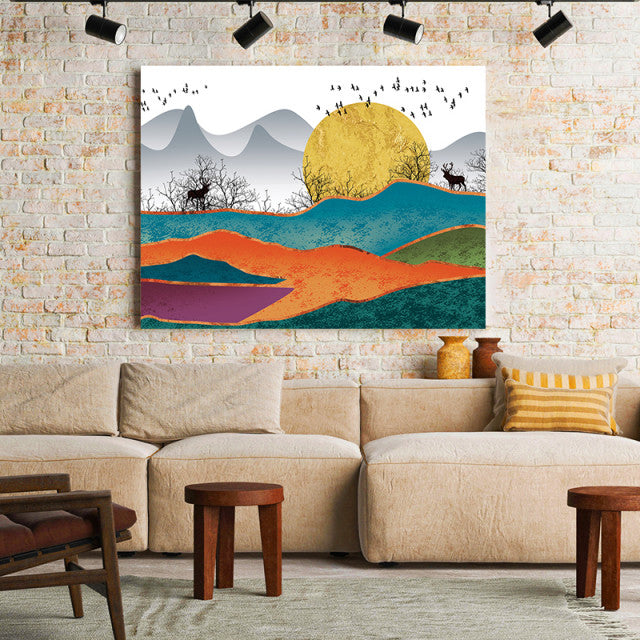 Pentru a da un look modern locuintei tale, alege acest tablou sublim, Golden Dawn Over The Hills, cu un peisaj stilizat si insertii aurii! Comanda-l acum!