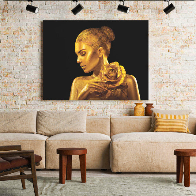 Lasa-te inspirat de senzualitatea si eleganta acestui tablou fastuos Golden Lady With Rose, cu o femeie cu un trandafor din aur, si comanda-l acum pentru locuinta ta sau pentru salonul tau de infrumusetare!